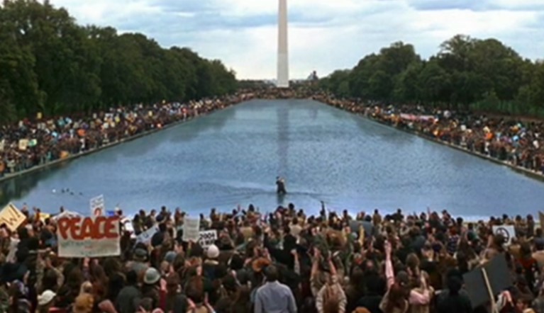 He is invited to speak to a tremendous crowd of people opposed to intervention in Vietnam and begins to do so but just as he does the PA system is unplugged by a policeman who is hostile to the movement. The event triggers many similar nonviolent protests throughout the south. Washington DC in front of the reflection pool.